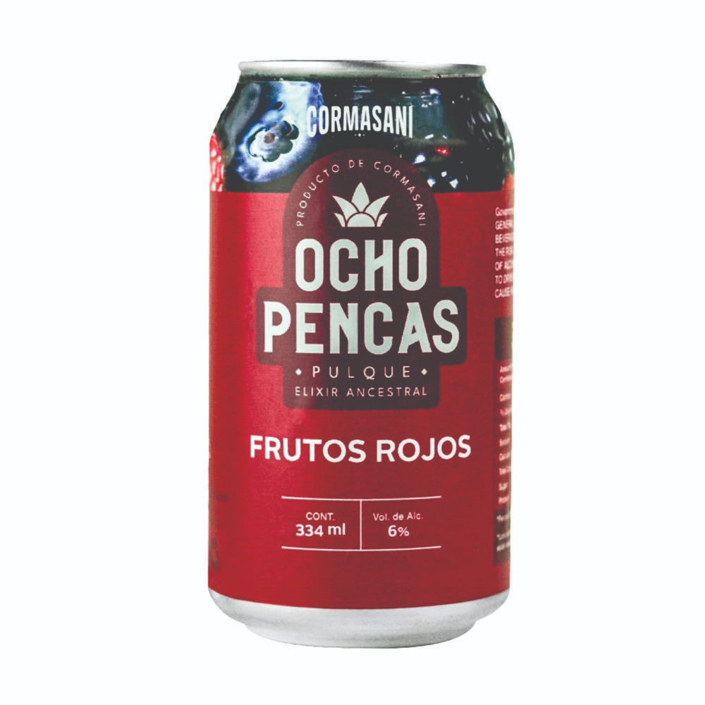 Pulque enlatado Ocho Pencas “Frutos Rojos”. Presentación: lata 334 ml.